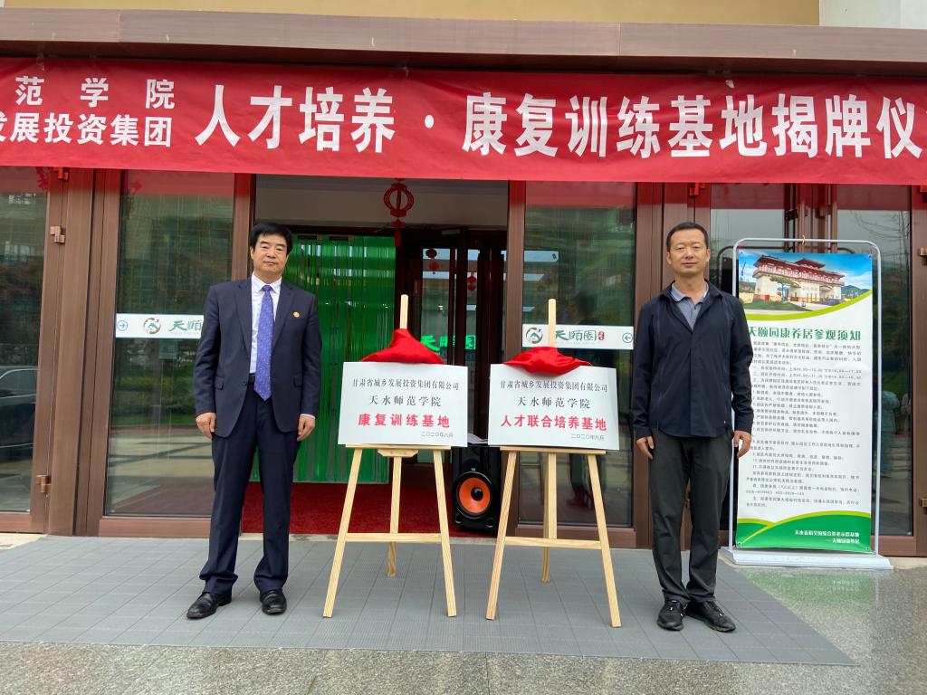 汪聚应、樊畠利分别代表校企双方揭牌“yl23411与甘肃省城乡发展投资集团人才培养基地”和“yl23411与甘肃省城乡发展投资集团康复训练基地”牌匾。
