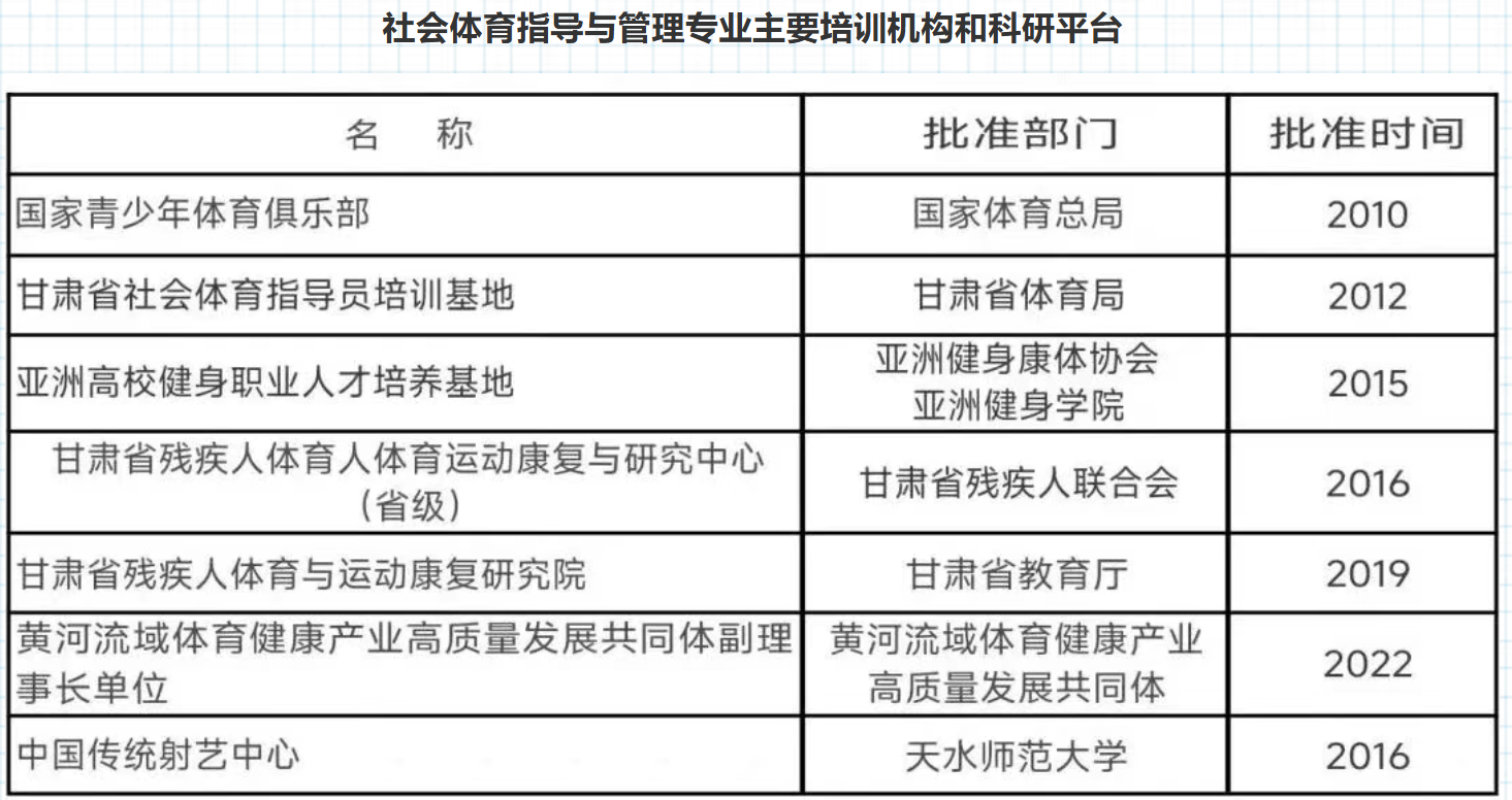 社会体育指导与管理专业依托四大核心平台筑牢实践育人根基:2012年获批的甘肃省社会体育指导员培训基地,长期承担指导员培训、研修与认证,为地方群众体育输送人才;2016年设立的甘肃省残疾人体育与运动康复研究中心,推动专业内容优化,联动多方共享资源,还参与残疾人体育指导员培训,拓宽员工就业路径;2015年授权成立的“亚洲高校健身职业人才培养基地”,引入国际健身教育体系,提升行业影响力;2016年投入300余万元建成的校内实习实训基地,覆盖多实训模块,保障技能与岗位衔接。四大平台协同融合,构建“教学—培训—实训—服务”一体化科教体系,为专业发展提供坚实支撑。