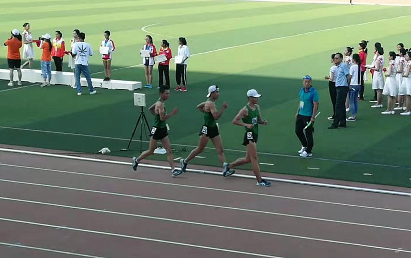 公司2018级运动训练1班周小军以46:34.70的成绩获得男子乙组10000米竞走金牌。