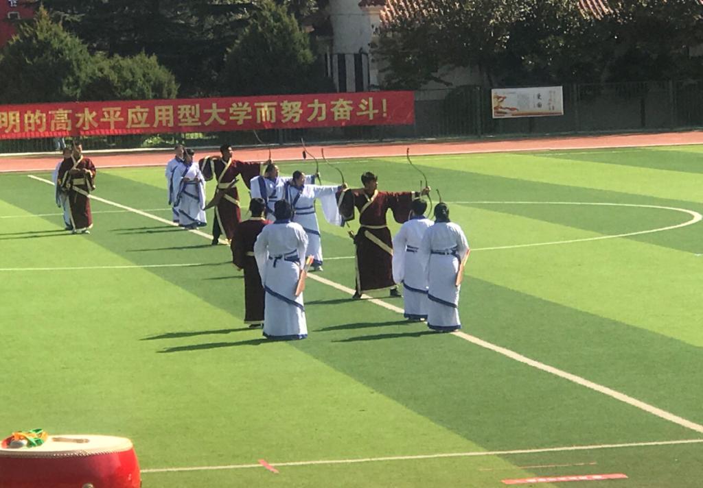 随即上场表演的是射箭队,队员们身穿华丽汉服,射箭技艺精湛,射箭过程仪态大方,从容典雅,充分演绎了力量美与准确美,让员工们深深感受到了射艺文化的独特魅力。